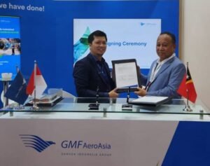 Penandatanganan kerjasama dilakukan oleh Direktur Utama Aero Dili, Lourenço de Oliveira dan Mukhtaris Aris, director of Line Operationdi PT Garuda Maintenance Facility Aero Asia (GMF) di Singapur, Kamis (28/09/2023).