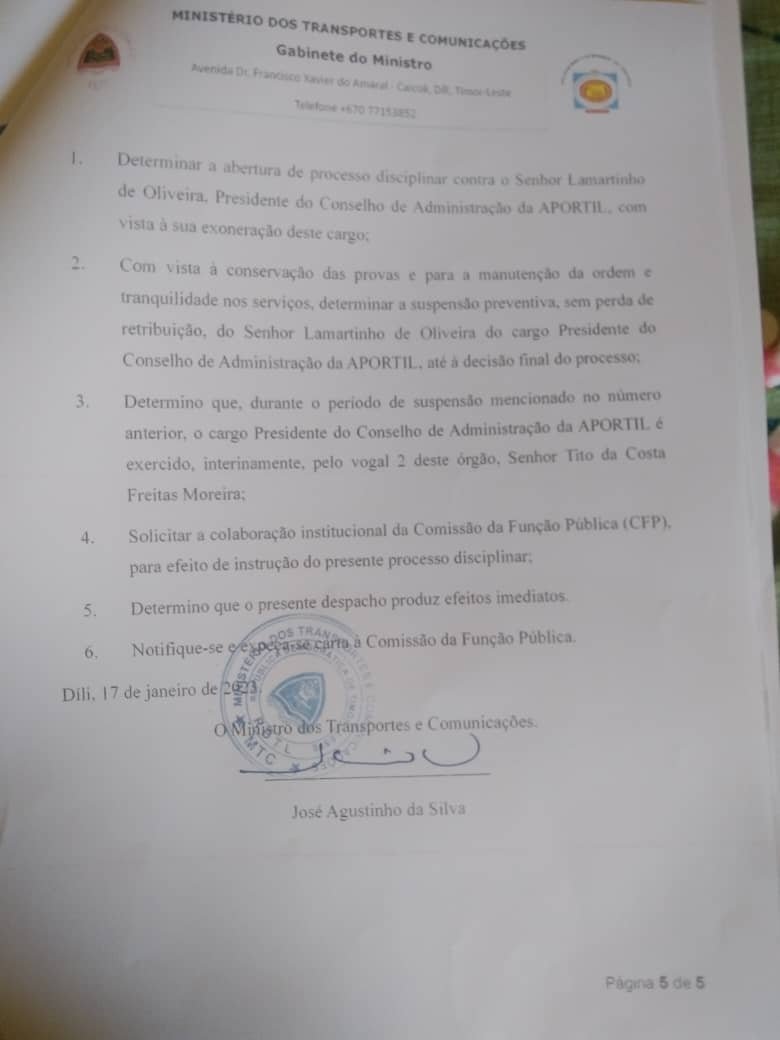 Ministru José Agustinho Ezonera Lamartinho de Oliveira Hosi Prezidente APORTIL