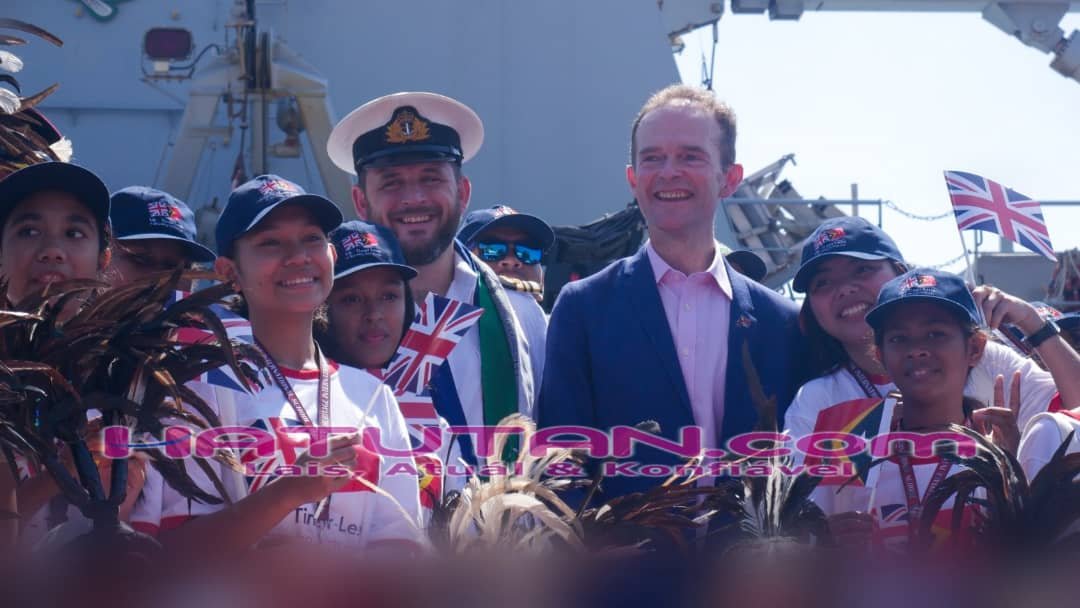 Governu Britániku liuhosi Embaixadór nomeadu, Dominic Jermey hamutuk ho Komandante bá Roo RHMS Spey, Kapitaun Matthew Millyard to’o iha Portu antigun Dili, Sesta (25/08/2023). Foto: Hatutan.com.