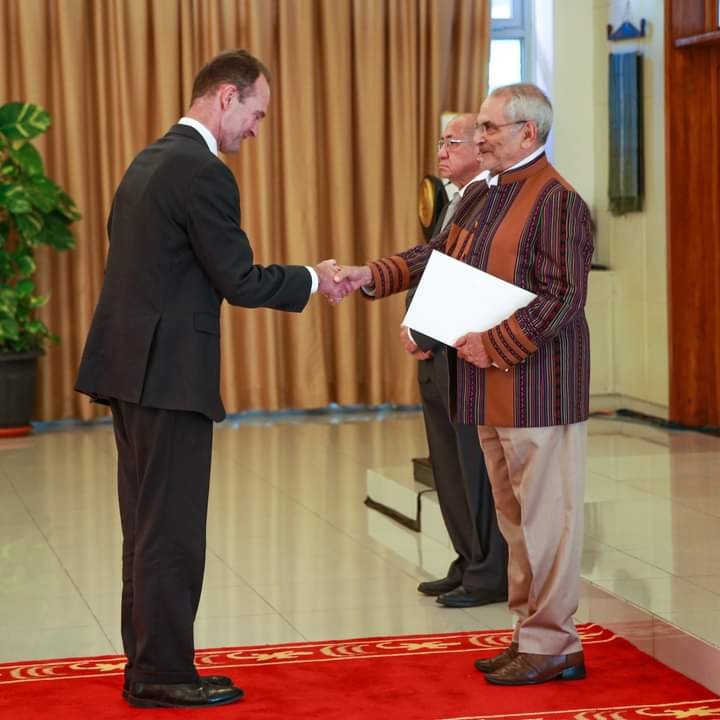 Embaixadór Reinu Unidu nian mai Timor-Leste, Dominic Jermey, entrega karta kredensiál bá Xefe Estadu, José Ramos-Horta iha Palásiu Prezidensiál Bairru-Pité, Díli, Sesta, 25 Agostu 2023. Foto: Média PR.