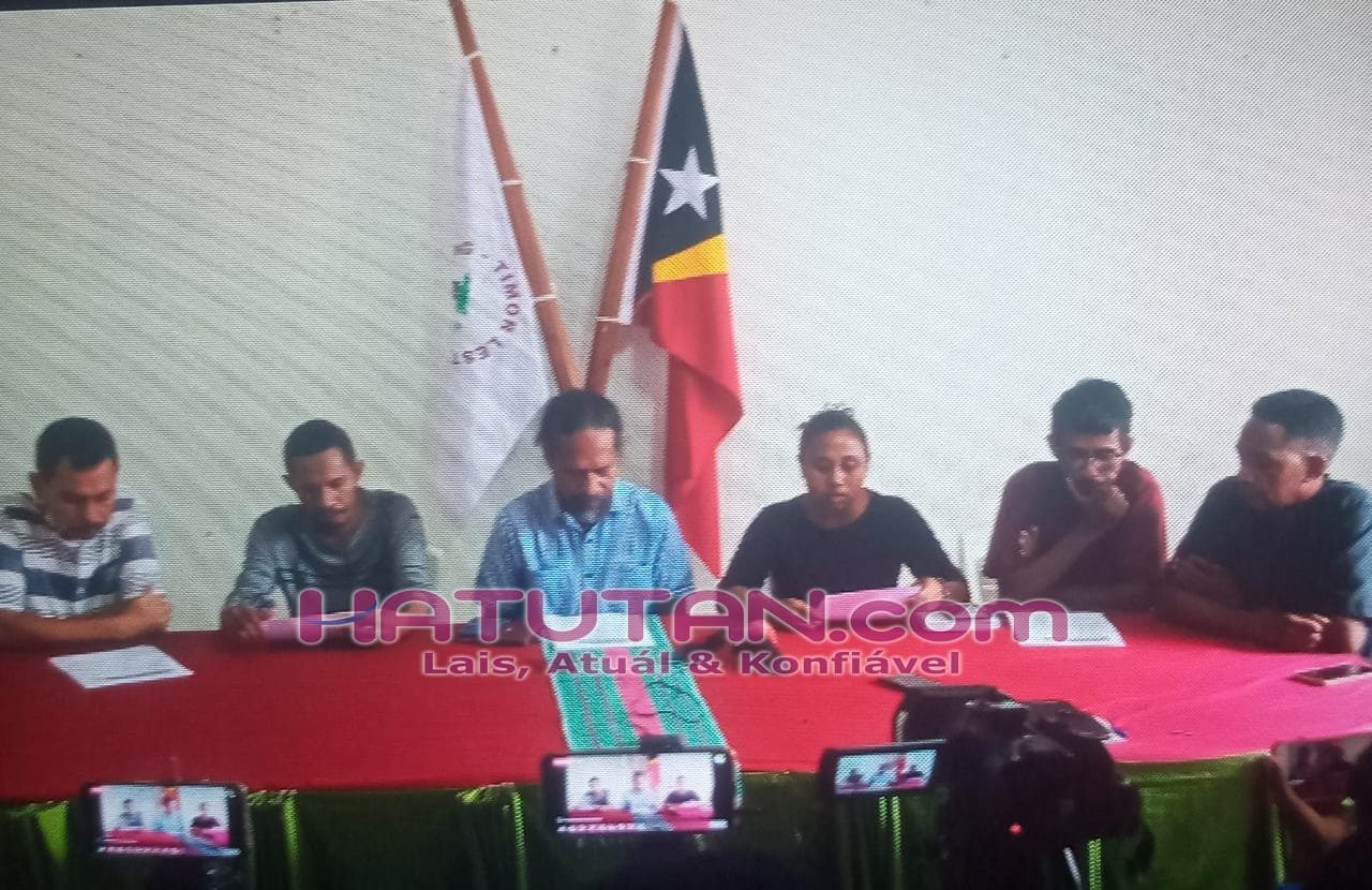 Diretór ezekutivu FONGTIL, Valentim da Costa Pinto ho ekipa hala’o konferénsia imprensa kona-bá irregularidade iha eleisaun suku tinan 2023, iha salaun FONGTIL, Caicoli, Segunda (30/10/2023). Foto: Leopoldina de Carvalho.