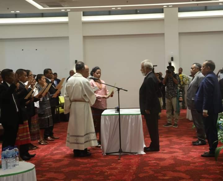 Primeiru Ministru (PM), Kay Rala Xanana Gusmão fó posse bá Prezidente Autoridade Rejiaun Admistrativa Espesiál Oecusse Ambeno (RAEOA), Rogério de Fátima Tiago Lobato iha Otél Oe-Upun, Palaban, Kuarta (31/01/2024). Foto: Média SEKOP.