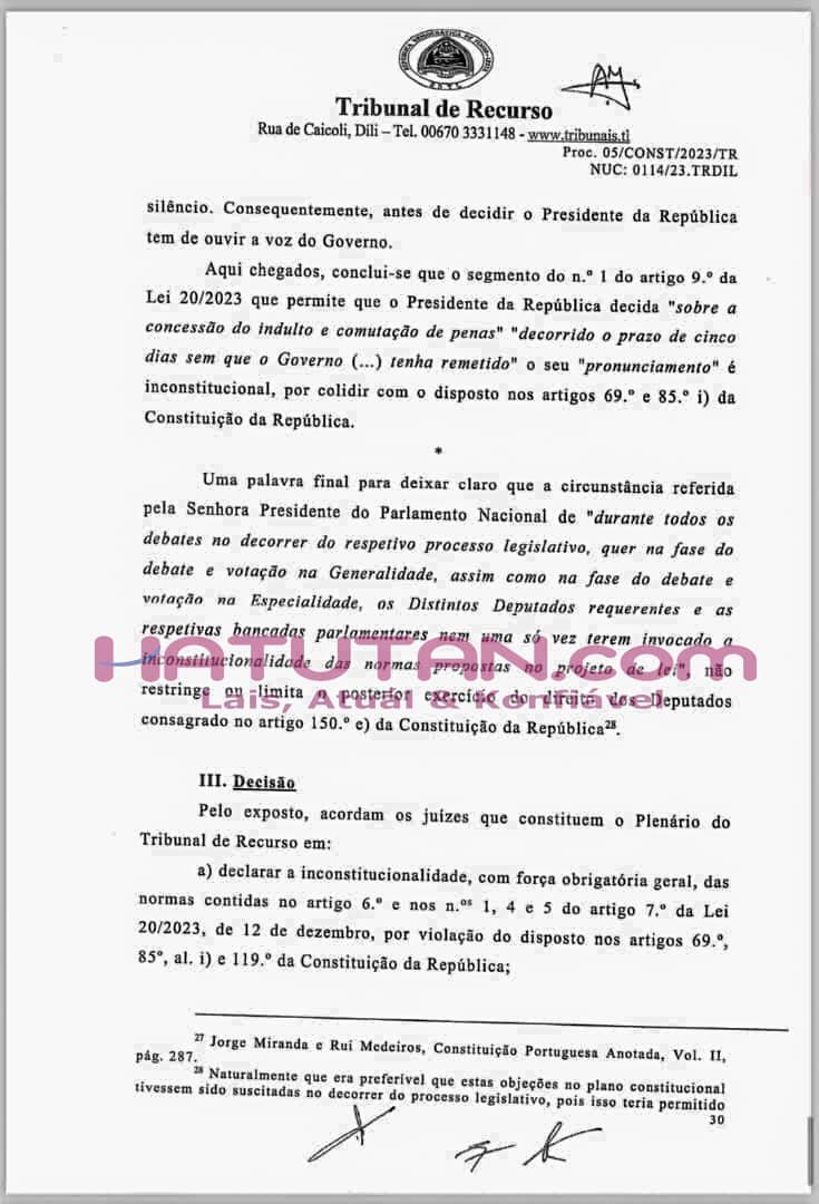 Konteúdu dokumentu ne’e hateten katak, hafoin to’o ona iha ne’e, konklui katak segimentu sira númeru 1 hosi artigu 9 Lei 20/2023 ne’ebé permite Prezidente Repúblika atu deside “kona-bá konsesaun indultu no komutasaun ba sentensa” “hafoin periúdu loron lima lakon ona se la iha Governu (…) ne’ebé haruka” nia “pronounsaun” ne’ebé la-konstitusionál, tanba konflitu ka bertentangan ho artigu 69 no 85 i) Konstituisaun Repúblika nian.
