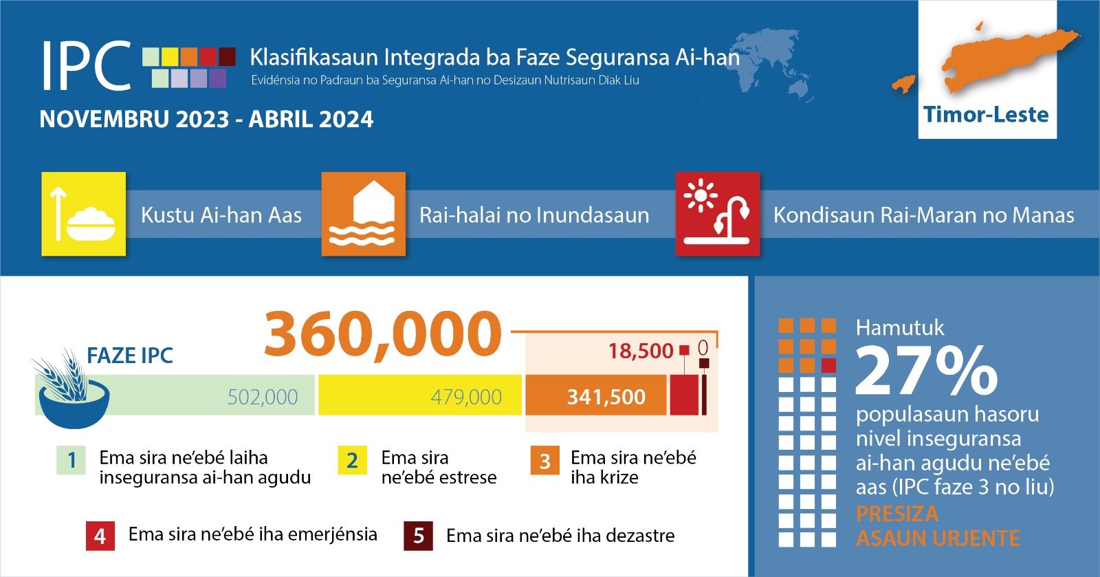 Hatutan.com, (01 Marsu 2024), Díli— Timor-Leste (TL) nia análize daruak kona-bá Klasifikasaun Faze Integradu (IPC– sigla inglés) Inseguransa Ai-han Agudu ne’ebé publika ohin loron hatudu katak, nivel frazilidade no deteriorasaun inseguransa ai-han iha munisípiu sanulu resin rua hosi sanulu resin haat iha Timor-Leste, iha períodu xoke klimátiku ne’ebé tutuir-malu ho aumenta ho folin ai-han ne’ebé aas.