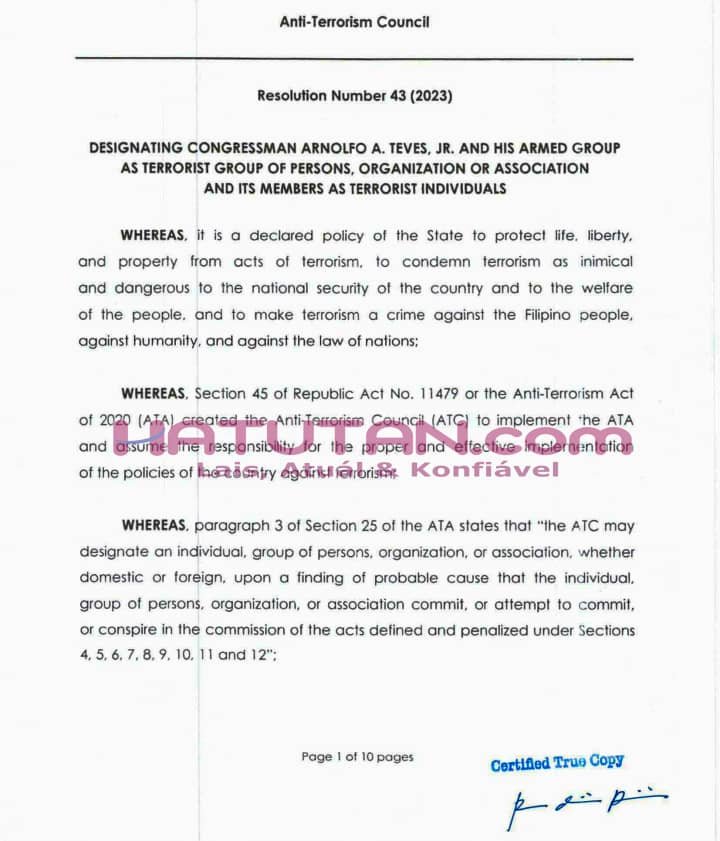 Tuir mai Hatutan.com hatún kompletu konteúdu dokumentu rezolusaun ATC númeru 43 (2023) ne’ebé deside no konsidera Arnolfo Teves, Jr ho nia grupu armadu hanesan terrorista.