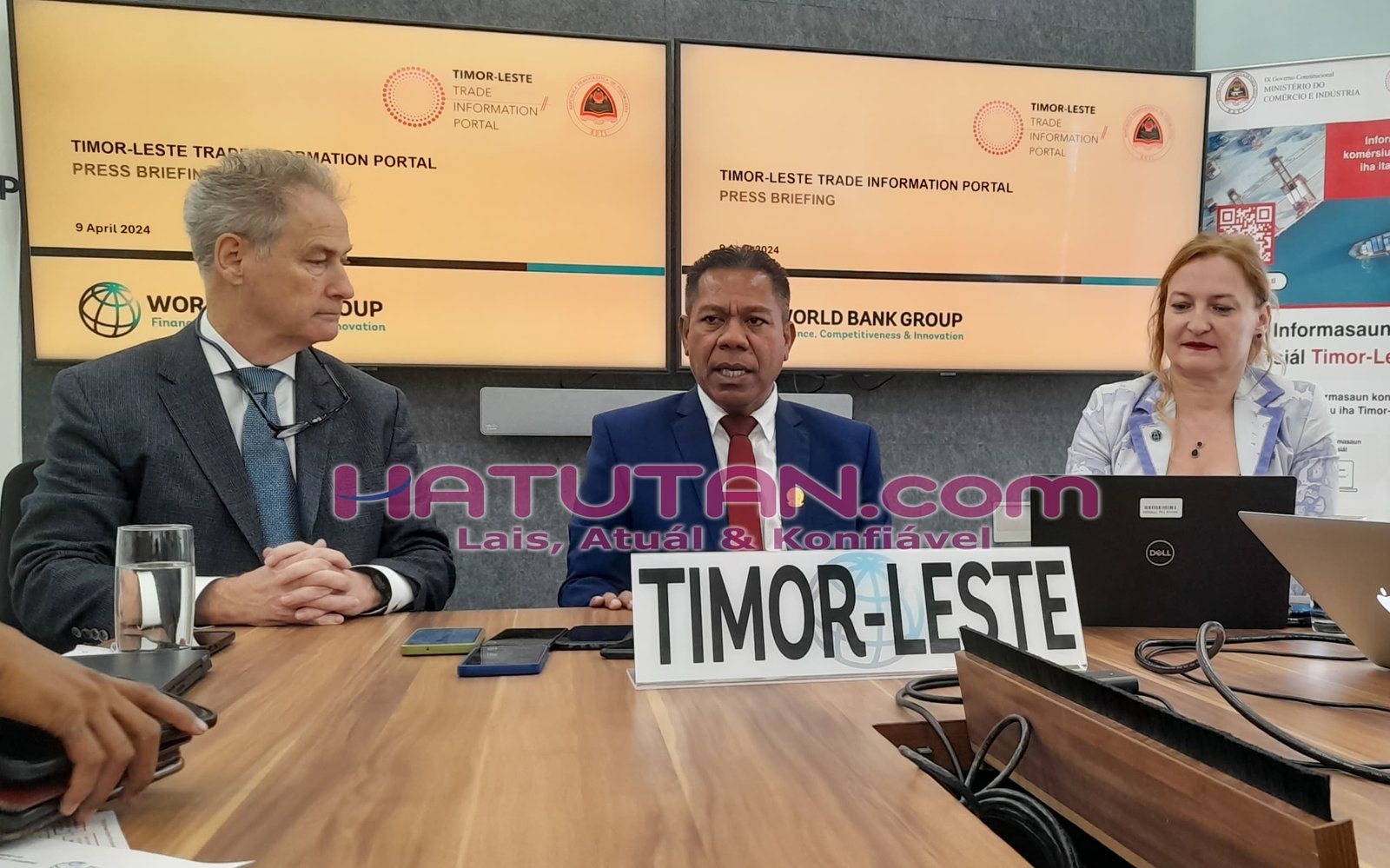 Vise-Ministru Komérsiu no Industria, Agusto Junior Trindade hamutuk ho reprezentante Banku Mundiál iha breefing ho órgaun komunikasaun sira iha edifísiu Banku Mundiál, Tersa (09/04/2024), informa iha loron-rua (2) tuir mai sei iha lansamentu boot ida bá portal informasaun komersiál ka trade information portal.