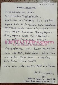 “Ha’u lakohi hanesan Benigno “Ninoy” Aquino Jr. Nia uluk bá Filipina tiru mate iha eskada aviaun tempu prezidente Marcos Jr. Ha’u husu haraik an dala ida tan, halo favor salva ha’u nia vida, halo favor autoriza ha’u hela iha Timor-Leste, ha’u nia vida iha ita-boot nia liman. Ho Sinseridade,” sita parágrafu balun husi karta nakloke ne’ebé fujitivu Teves Jr haruka bá PM Xanana Gusmão.