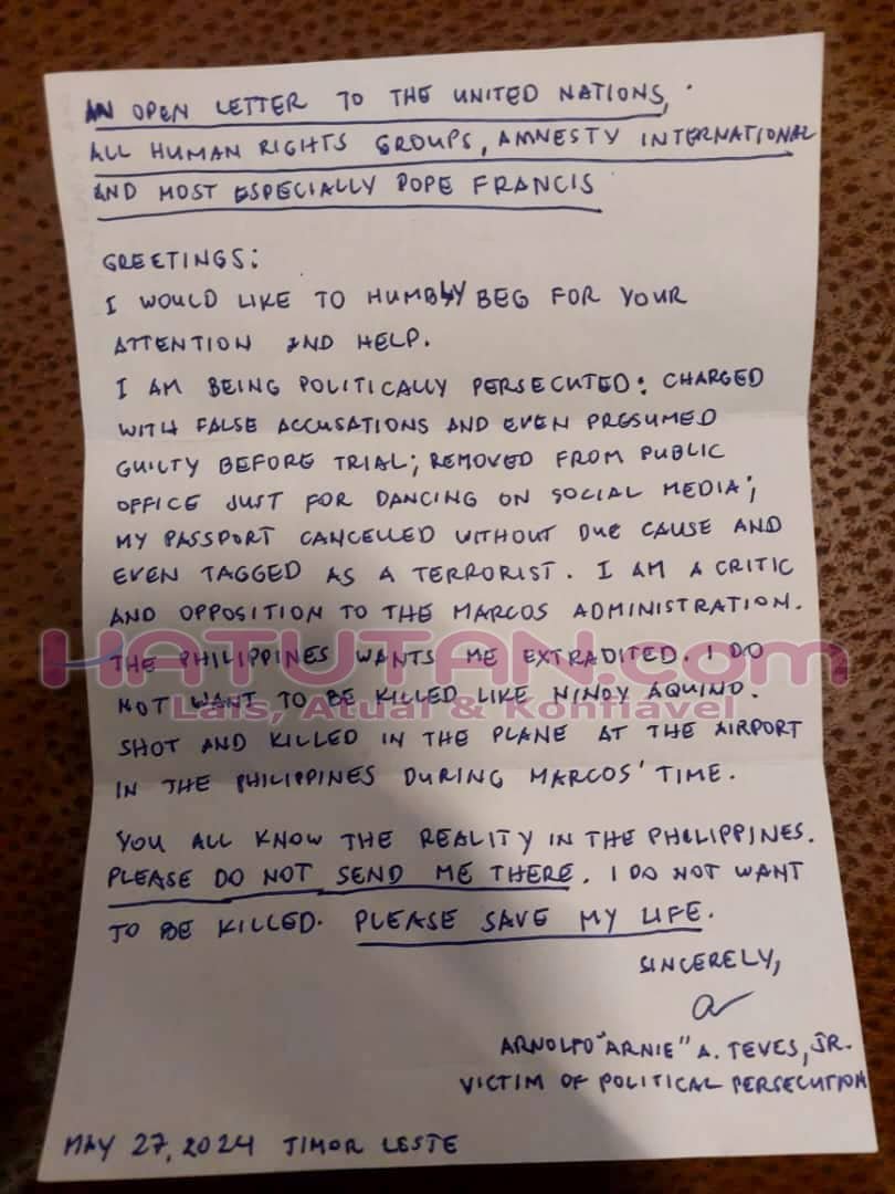 Karta nakloke ba Nasoins Unidas, Grupu direitus umanus hotu-hotu, Amnesty International no espesiál ba papa Francisco, ne’ebé Hatutan.com asesu, Domingu (02/06/2024), haktuir Fujitivu Arnolfo Teves Jr ho nasionildade Filipina ho laran tomak husu pedidu atu organizasaun internasionál sira liu-liu ba Nasoins Unidas no Papa Francisco atu bele ajuda hodi salva nia vida.