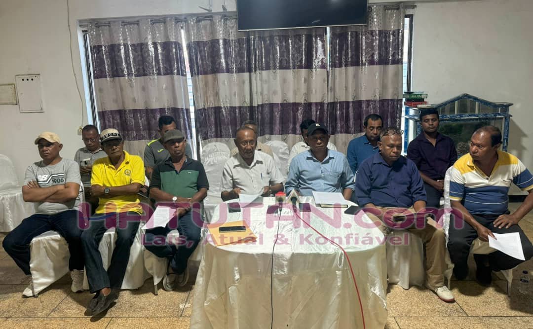 Fundadór FFTL no antigu jogadór selesaun nasionál Timor-Leste halo konférensia imprensa liga ho penalidade ne’ebé AFC hamonu bá jogadór selesaun nasionál Jaimito António da Costa Soares tanba falsifika idade. Foto/Elio dos Santos da Costa
