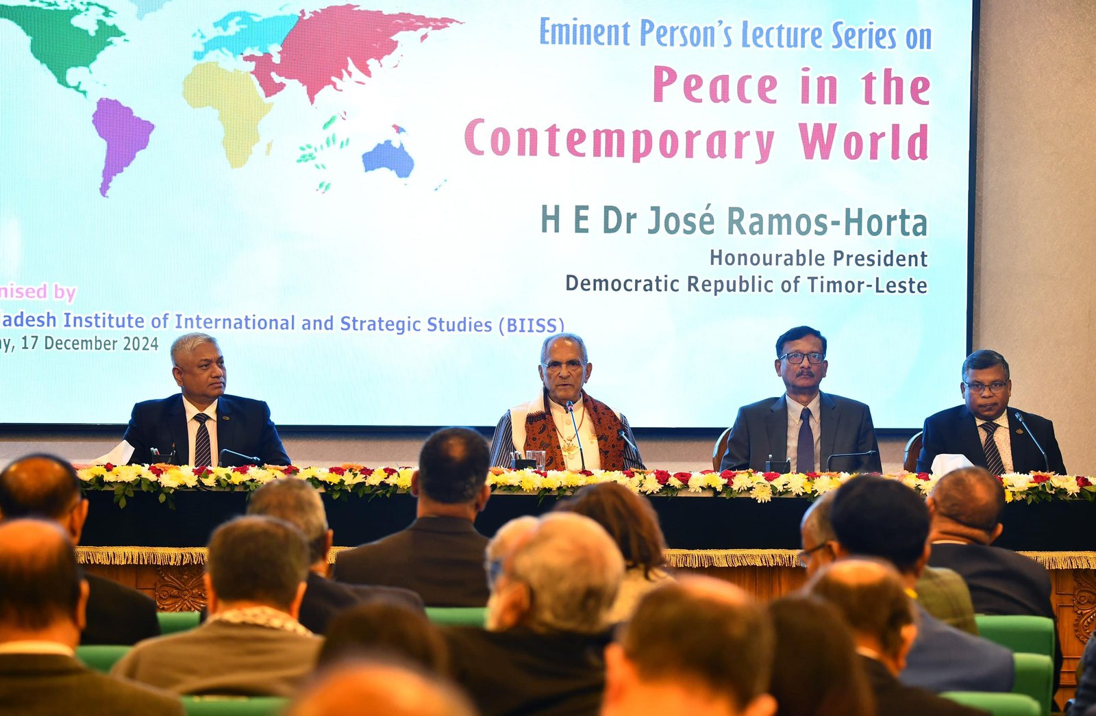 Hatutan.com, (18 Dezembru 2024), Díli- Prezidente Repúblika (PR), José Ramos-Horta sai oradór prinsipál iha Bangladesh Institute of International and Strategic Studies (BIISS) hodi destaka preokupasaun sira kona-bá “Dezafiu Pás iha Mundu Kontemporáneu” liga ho konflitu globál oioin, inklui funu Ukránia-Rúsia, krize sira iha Síria, Israel no Palestina inklui situasaun rejionál iha Myanmar.