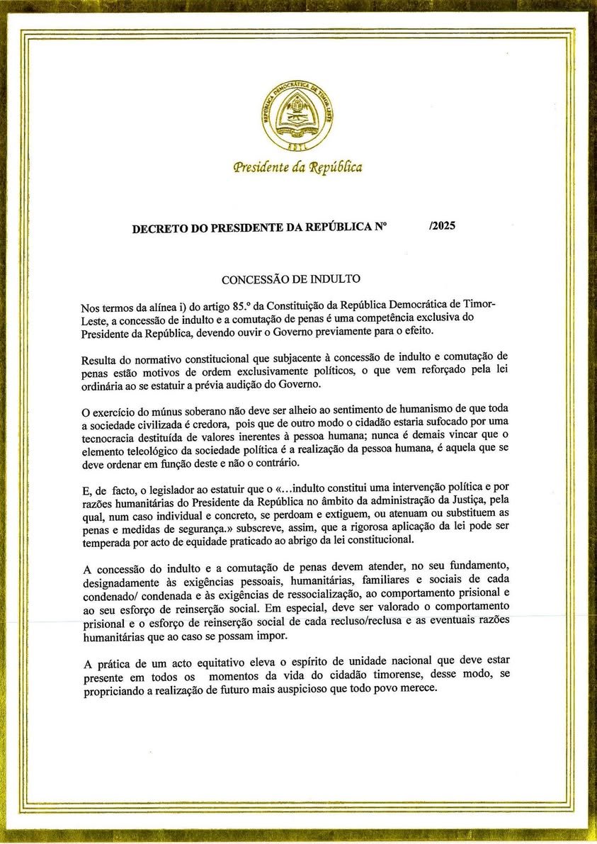 Komunikadu imprensa ne’ebé Hatutan.com asesu haktuir afirmasaun Prezidente Repúblika, José Ramos-Horta nian dehan indultu hirak-ne’e reflete Timor-Leste nia kompromisu ba justisa ho mizerikórdia no Timor oan nia fiar ba ema hotu-hotu nia dignidade fundamental.