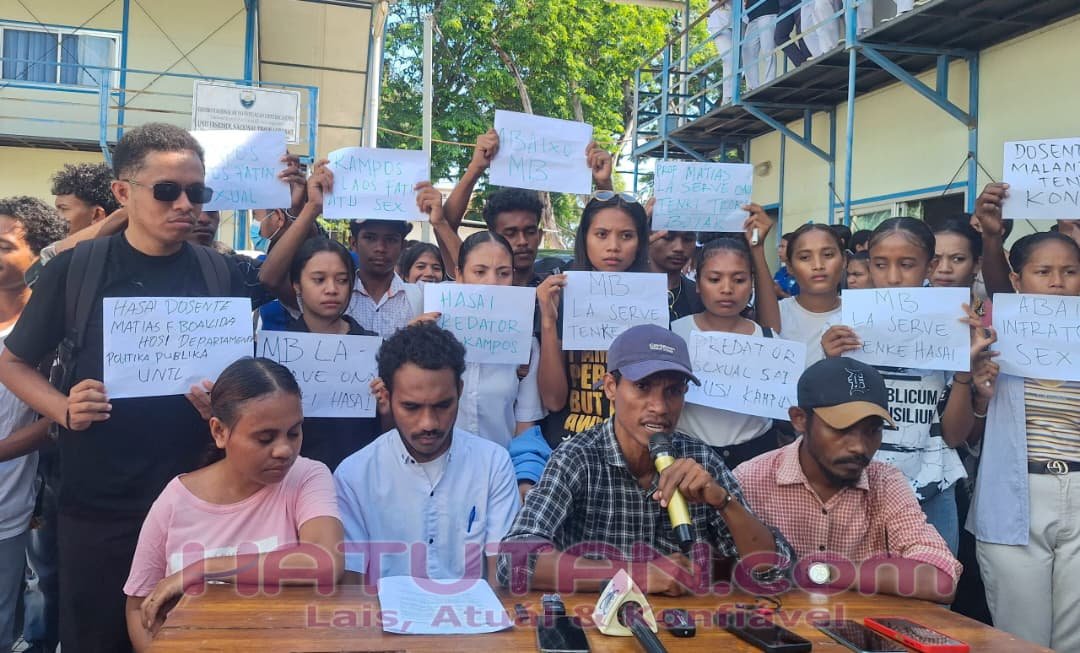 Estudantes ativu sira husi Departamentu Polítikas Públikas, Fakuldade Siéncia Sosiais (FCS, sigla portugés) UNTL fó ultimatu loron-tolu (3) demite dosente ho inisiál MFB tanba deskonfia prátika hahalok esédiu sexuál estudante feto sira balu. Foto/Juvinal Cabral dos Santos