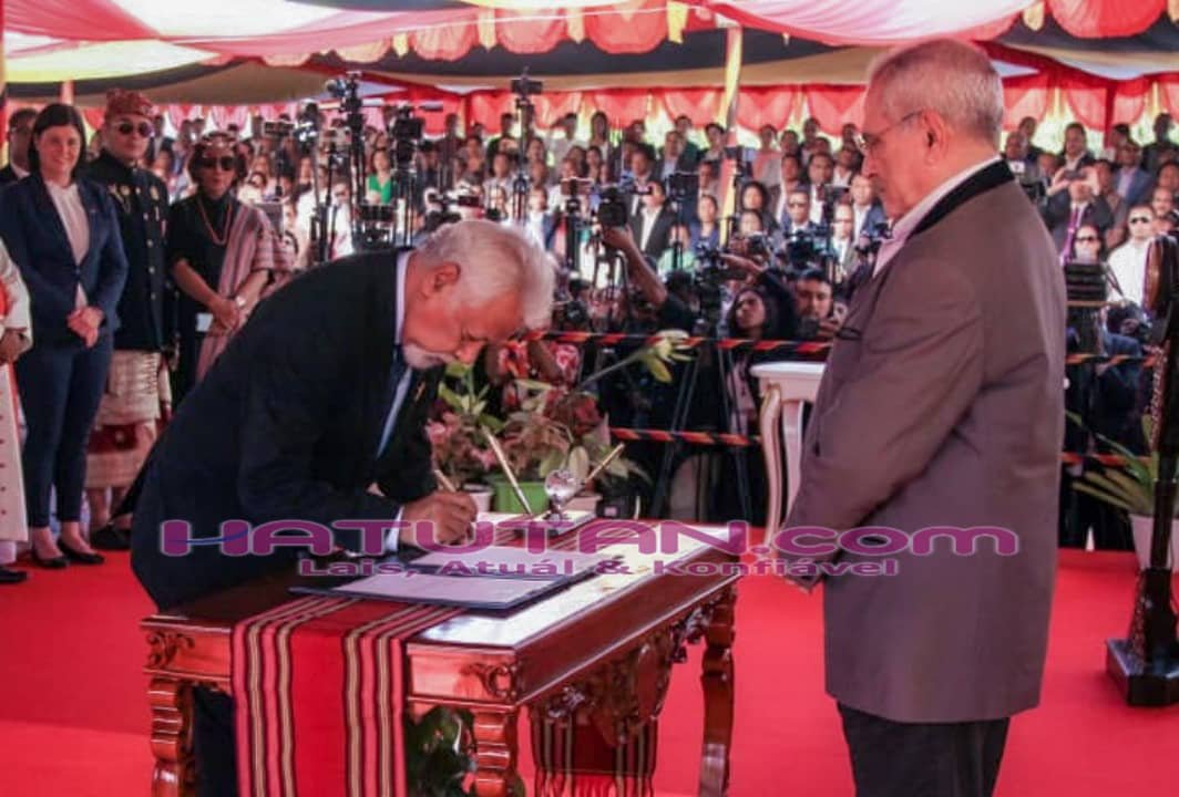 Primeiru Ministru (PM), Kay Rala Xanana Gusmão asina termu posse perante Prezidente Repúblika no Prêmio Nobel da Paz José Ramos-Horta, iha loron serimónia fó knaar ba IX Governu Konstitusionál Repúblika Demokrátika Timor-Leste, Díli, loron 01, fulan-Jullu, tinan-2023. Foto/Dok.