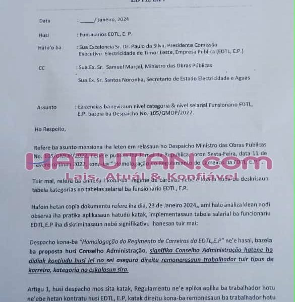 Hatutan.com, (31 Janeiru 2024), Díli—Funsionáriu antigu sira iha Eletrisidade Timor-Leste, Empreza Públiku (EDTL,E.P) hamutuk na’in-500 hakfodak no triste ho realidade, ohin loron, ko’a sira-nia saláriu kada...