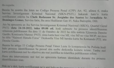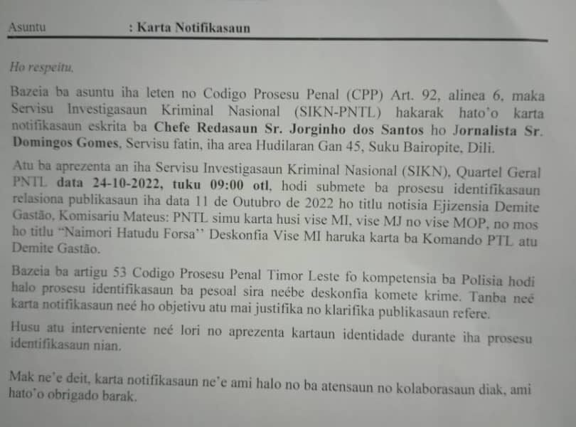 Hatutan.com, (21 Outubru 2022), Díli- Conselho de Imprensa (CI) Timor Leste sei haruka karta lamentasaun bá Komandu Jerál Polísia Nasionál Timor Leste (PNTL) ne’ebé haruka karta notifikasaun...