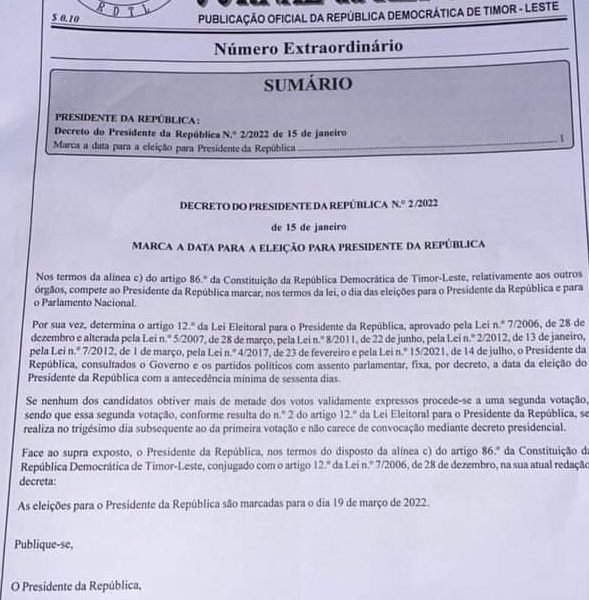 Hatutan.com (15 Janeiru 2022) Díli— Konstituisaun Repúblika Demokrátika Timor Leste (K-RDTL), liuhosi artigu 86, alínea c), fó kbiit ba Prezidente Repúblika (PR) marka data eleisaun prezidensiál...