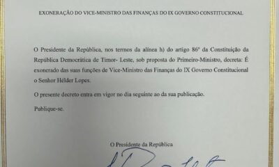 Hatutan.com, (08 Setembru 2023), Díli—Prezidente Repúblika (PR), José Ramos-Horta aprova ona pedidu hosi Primeiru-Ministru (PM) Kay Rala Xanana Gusmao ba ezonerasaun Vise-Ministru Finansas, Helder Lopes atu...